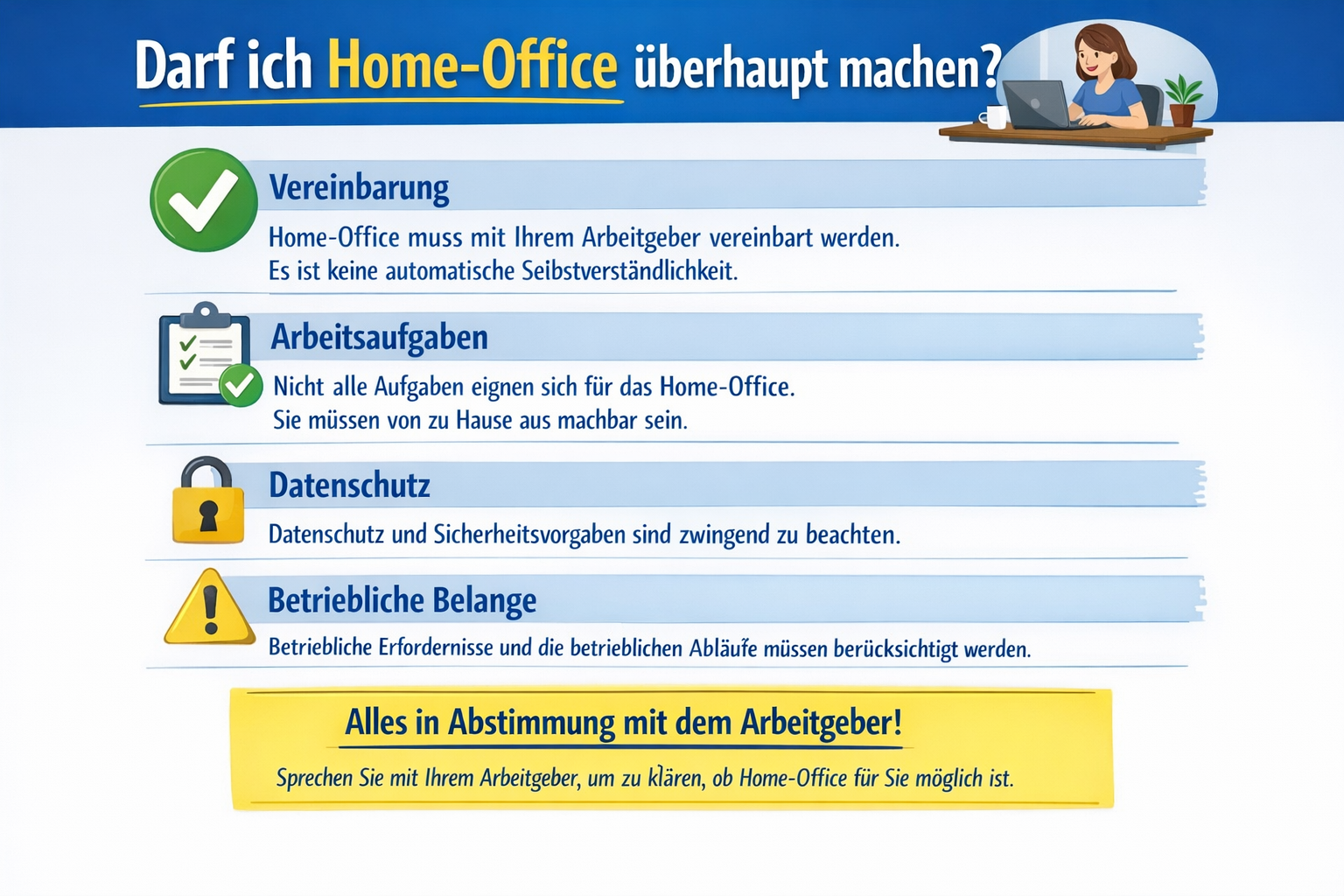 ✅ To-Do Warum wichtig Mit Arbeitgeber besprechen: Ob Home-Office erlaubt wird — und ggf. Zusatzvereinbarung…